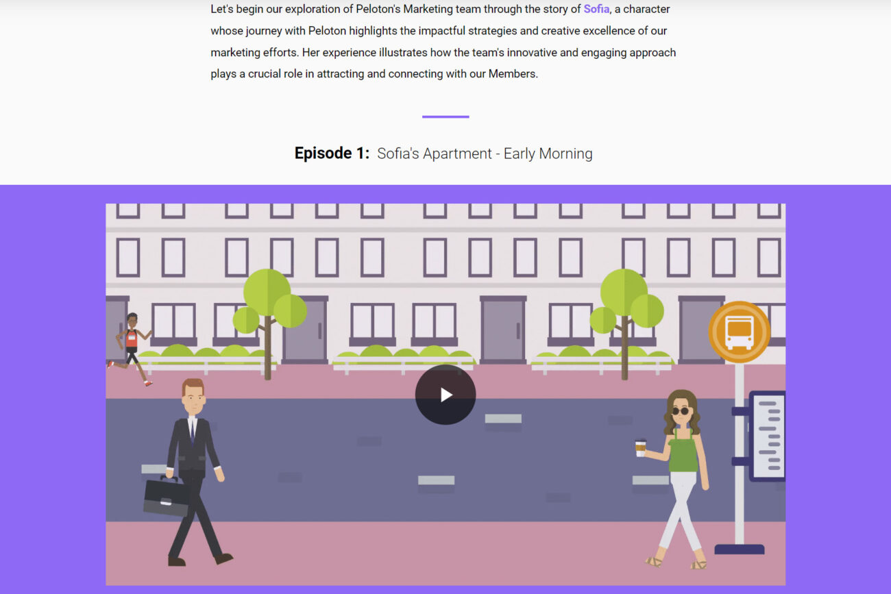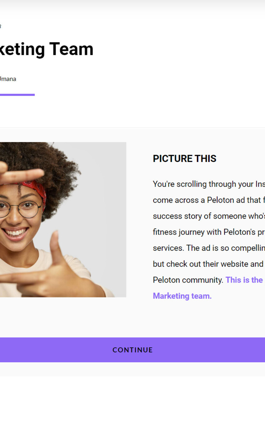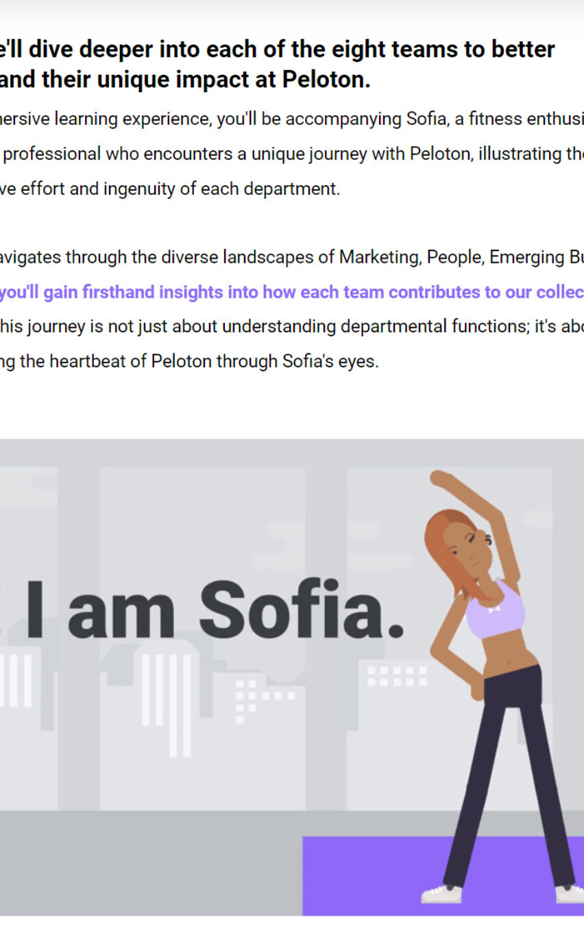 By developing an eLearning module that provides a high-level introduction to each of Peloton’s business units, framed within the engaging customer journey of a character named Sofia, I aimed to reassure new team members that they can easily understand the crucial roles different teams play in Peloton’s success. The story was broken down by team, thereby directly tying the story to each team’s involvement in the customer’s journey, and making the content more digestible and relevant throughout the lesson. This approach enriches the learning experience and streamlines the live event content, making the onboarding process more efficient and engaging.