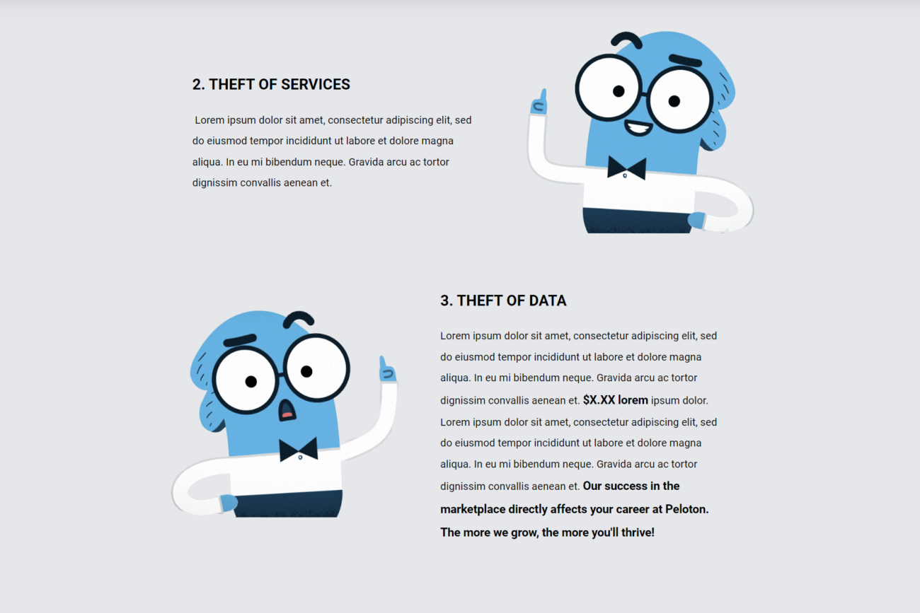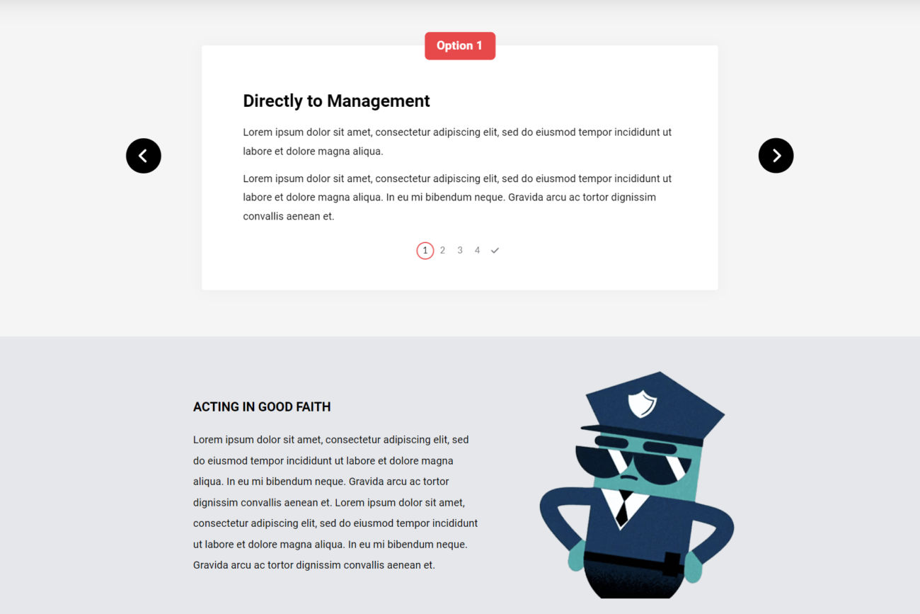 The lesson included third-party educational videos featuring lively cartoon characters. I brought the characters into the eLearning to maintain continuity across the modules, spark interest, and keep the learner engaged. Adobe Photoshop was used to seamlessly transfer these characters from the videos into the Articulate Rise lesson. Key strategies included using interactive blocks, like the Process block, to demonstrate actionable steps for reporting misconduct.